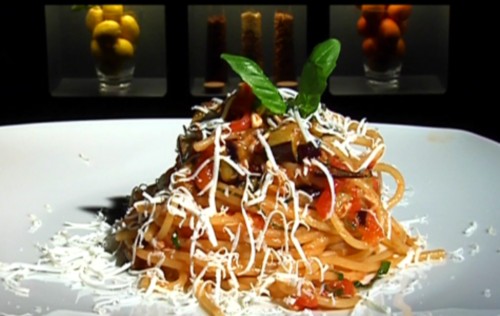 La pasta alla Norma è un piatto di spaghetti conditi con pomodoro fresco, melanzane fritte a cubetti e basilico fresco; è assolutamente vietato grattugiarci sopra grana o parmigiano (formaggi polentoni… si rovina la pasta!): solo la ricotta salata può esaltare la prelibatezza di questa pietanza tipica della Sicilia!